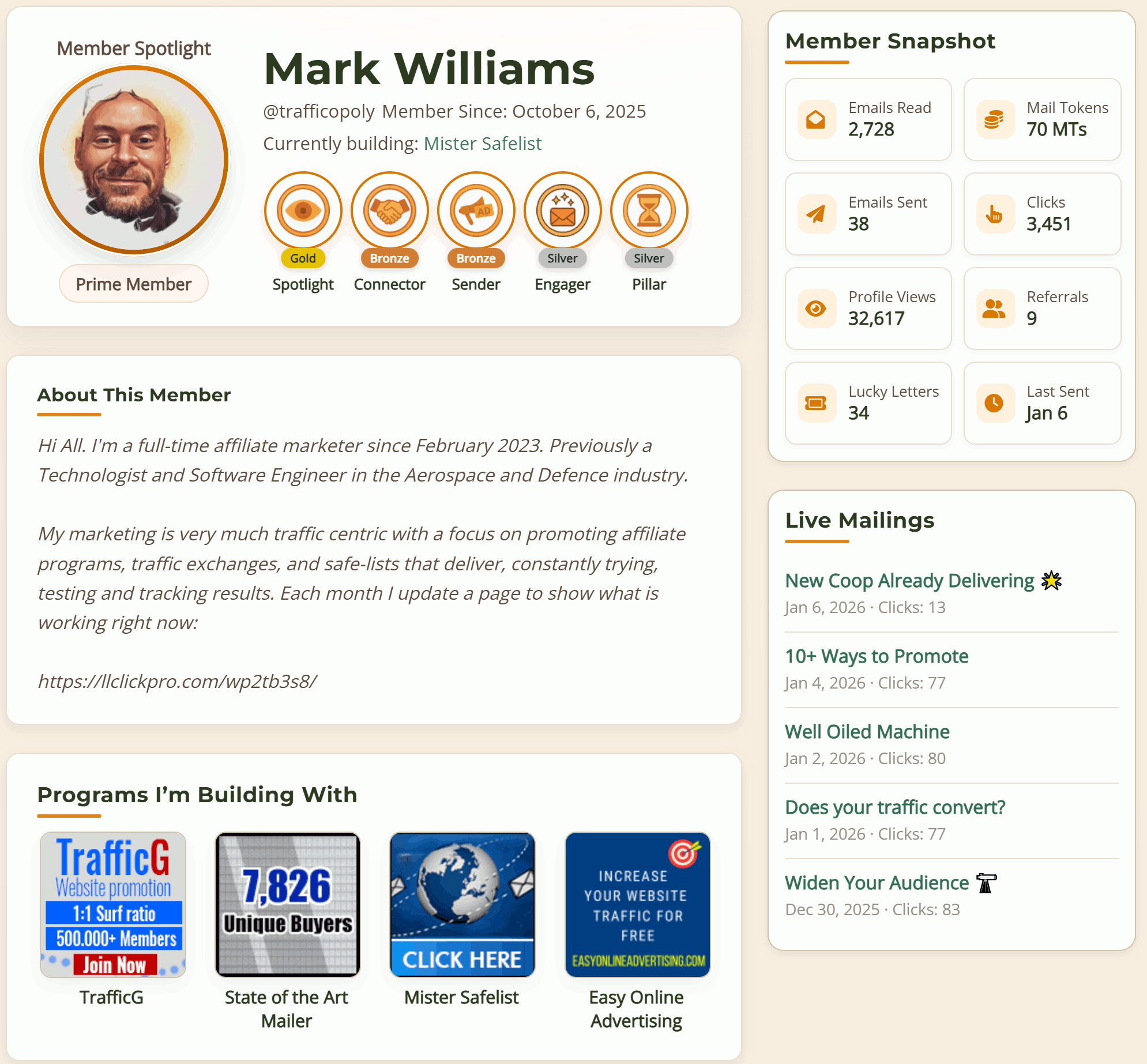 You also get your own advertising profile to brand yourself and further show your current opportunities, Jerry also advertises Prime members profiles to other safelists giving you a little extra exposure.